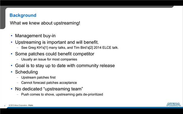 Altera has been, for the most part, a closed-source company with little, if any, contributions to any open-source projects. So when Altera decided that they needed to upstream everything possible for supporting the Altera SoCFPGA platform, most people in the company did not really understand what that really meant. From IT infrastructure, to all levels of management, Dinh had to educate that upstreaming with community involvement was the way to go for this platform. That it will yield benefits in the future. This also involved members of Dinh's own development team, who have never contributed before, to start contributing. And to also get into the mindset of upstream first. For example, the Linux support for Altera's SoCFPGA platform is mostly upstreamed, so Dinh's team can move to the latest Linux kernel within 1-2 hours of a kernel release. While our U-Boot support has been lacking,