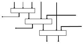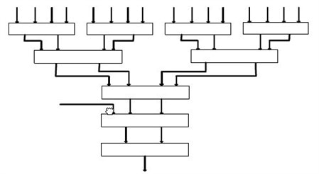 表达式中:In1~In4为部分积输入信号;Cin为邻近压缩器进位输入;Sum为伪和;Carry和Cout为进位输出,其权值相同。由图及表达式知,输出进位与输入进位式相互独立的,即输出并不由输入产生,这样就能保证部分积同时且独立地相加。4-2压缩器对部分积进行压缩的图如图2【5】所示: