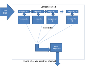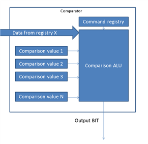 The comparators will have some registers to set some comparison values and a command registry to tell for example use comparison values 1 and 2  as well as comparison values 3 and 4 as lookup ranges, or find any of the masks(value) on the comparison value registers.
