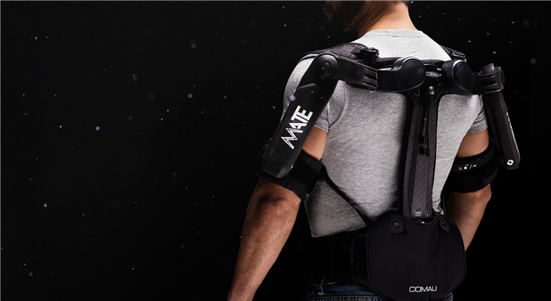 Comau’s Mate-XT wearable exoskeleton can improve a worker’s job performance. It can be worn for construction, carpentry, agriculture, assembly, logistics, and more. (Image Credit: Comau Robotics)