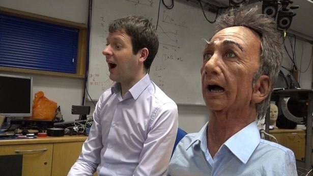 Cambridge University created a robot mimic named Charles. Charles still has a lot to learn but he is really good at reproducing people’s facial expressions. Charles mimics a subject next to him: Charles on the right, subject on the left. (Image via Cambridge University)
