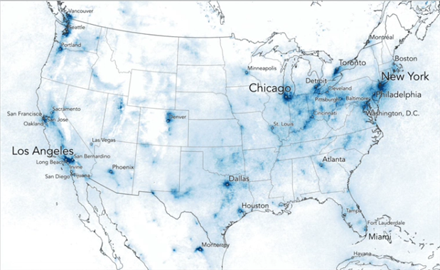 Certain parts of the United States have seen a drastic reduction in emission levels. The darker blue areas represent more pollution. I'm in Chicago... not looking so good. (Image Credit: Descartes Labs)