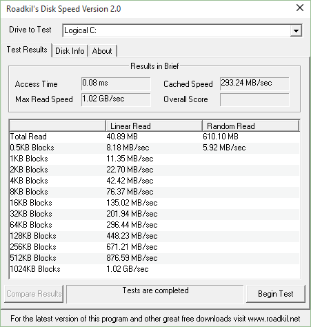 For a rather unfair comparison, this is the figures for my C Drive which is a SAMSUNG 940 SSD, that will blaze up to and in excess of 1GB/s, I doubt the SAMSUNG would be working at -40Deg C though or at +85