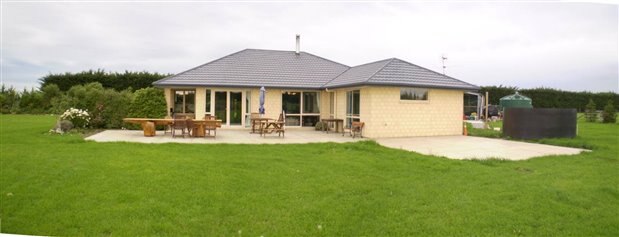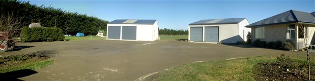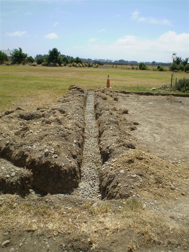 Because the area is 120 m2 (1300 sq ft) water runoff was dealt with by a 50mm (2inch) fall to the grass and a 150mm drain hose to a deep soak hole.
