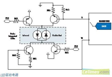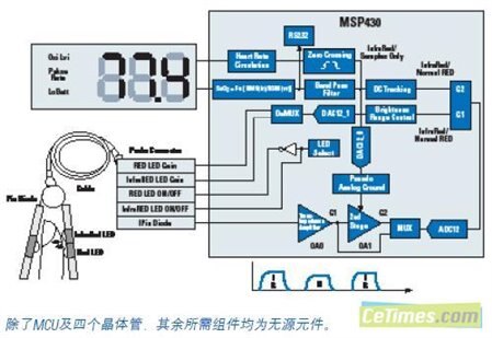 上面的图标示例了一个采用超低功耗MSP430 MCU的单片、便携式脉搏血氧计的实现。由于高层次的模拟集成使得外部组件数量保持了最小化。并且,通过保持通态时间(ONtime)的最小化以及两个灯光源的周期性供电,使得功耗得以降低。