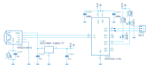 A minor point was, for the USB UART, for MCP2221 I already have Android code. But FTDI is totally fine too, i.e. if you've already got the schematic entered for that portion then it's quicker for me to just hunt for demo code for FTDI, if you let me know the chip number. Below is the the schematic I've used previously for the MCP2221 (it needs an external 3.3V regulator which probably the FTDI device doesn't, and has 4kV protection which likely isn't enough, I didn't place any additional ESD protection on this schematic).