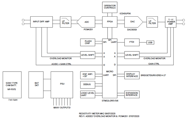 Quick observation on the block diagram, ADC monitors voltage probes, but one thing that I cannot spot is provision for measuring/monitoring the injected current? If running in mode of conventional resistivity kit (square wave with constant current) then need a way to set and then monitor; if square wave with constant voltage, or a non-square-wave other waveform, need to continuously measure current to compute res?