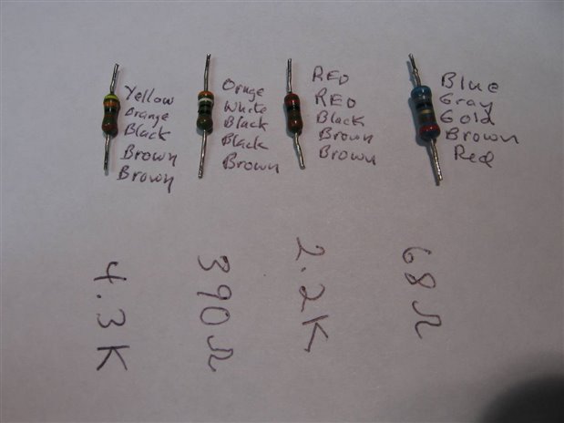 The idea is they have 3 numbers then a multiplier, so for resistor three its 2, 2 0, 1 or 220 x 10 (I simply do 1 extra zero on the end) or 2k2.