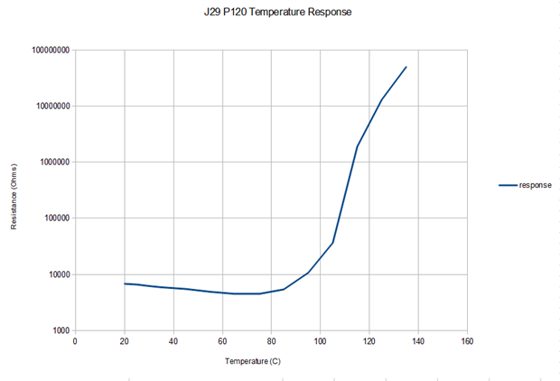 I graphed this but I had to shift the resistance scale logarithmically  and it was too much of a mess to post but you can get the idea. While my measurements did not match the data sheet exactly it is probably due to my not matching the current of the manufacturers test conditions. The resistance of the PTC acts like a NTC thermistor from the 20 C room temperature to about 60 C and then it turns PTC and increases rapidly to 50 Megohms at 135 C. Thanks again to everyone who took the to put me on the right track to identifying this part.