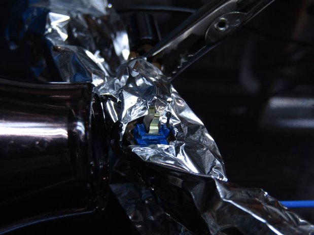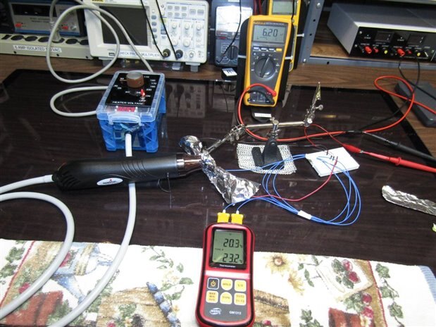 The blue box is the control for the heat gun. I can produce temperatures between room temperature and 340 C. The Fluke is monitoring the resistance of the PTC device and the Red meter is a thermal couple thermometer of which I only used the bottom probe. The PTC is clipped to the Thermal Couple so that they have nearly the same temperature. The aluminum foil to to protect my plastic probe clips from melting. Here is a close up of the PTC and the Thermal Couple poking through the foil.