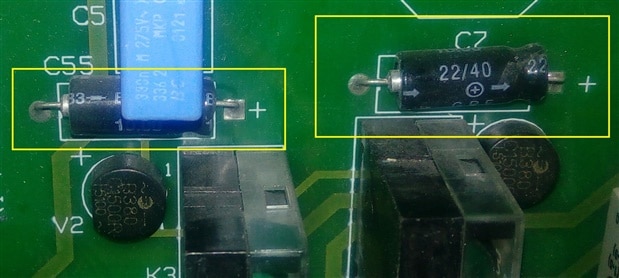 Both capacitors (marked yellow) should be the same and the visible markings are: