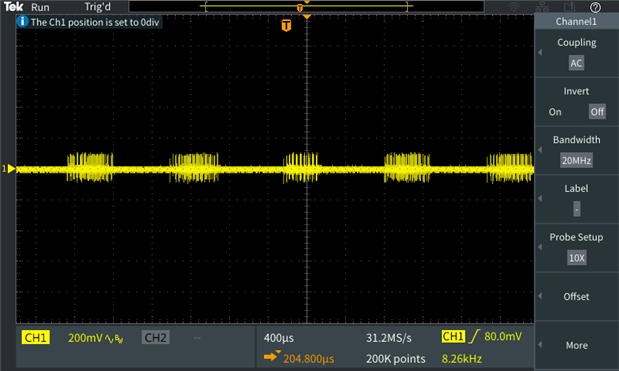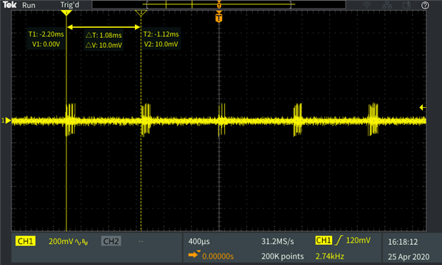 First capture is with the oscilloscope in DC. 2 V and 10 ms / div.