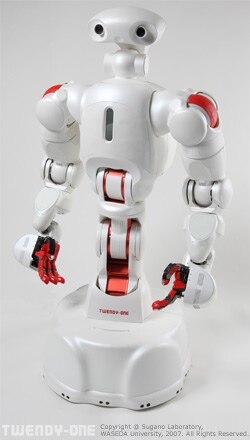 Toyota and Waseda University have developed a system enabling the assisted-living robot TWENDY-ONE and people to pass each other safely. Publicly unveiled in 2007, the robot was designed and built by researchers from Waseda University’s Sugano Laboratory to help the elderly or disabled lead more independent lives. A special feature of TWENDY-ONE is its combination of dexterity with passivity and high-power output. TWENDY-ONE is equipped with high output actuators based on a simple passive impedance mechanism. When manipulating objects of various shapes, the robot readily adapts to specific objects passively based on evaluations of the external forces imposed during positional changes. In the same way, TWENDY-ONE can adapt to human motion and actually grasp a human. It can both manipulate objects and support humans. The entire surface of the arm of the robot features distributed force sensors, allowing the robot to grasp humans and lift heavy objects based on feedback from the entire arm. The finger tips on its hand are made of a soft material, with a gentle, curved, human-like surface and fingernails which can reliably grasp various objects such as soft plastic or paper cups and freely manipulate small objects such as straws or pencils. TWENDY-ONE also features an omni-directional mobile mechanism to allow efficient mobility, even in confined spaces. This mobile mechanism integrates 12 ultrasonic sensors and a six-axis force sensor to detect nearby objects and humans and to ensure safety. The torso is capable of movement in four degrees of freedom. Joints feature high-power actuators to allow the robot to pick up heavy objects from the floor and to support the human body. A backpack-like compartment contains TWENDY-ONE's whole-body controller. LEDs on the region corresponding to the chest display the internal states of the robot. For more information please visit: http://translate.google.com/translate?hl=en&sl=ja&u=http://www.robonable.jp/news/2011/01/31sugano.html&ei=9M9JTbOGHcL98Aa31vHBDg&sa=X&oi=translate&ct=result&resnum=1&ved=0CBkQ7gEwAA&prev=/search%3Fq%3Dhttp://www.robonable.jp/news/2011/01/31sugano.html%26hl%3Den%26client%3Dfirefox-a%26hs%3D1x5%26rls%3Dorg.mozilla:en-US:official%26prmd%3Divns