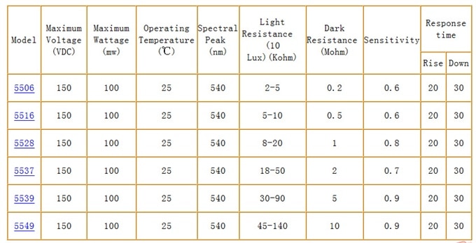 I am new to electronics.  I am looking at purchasing a photocell (photoresistor) for some of my projects.  I have observed that there are different levels of light resistance for different photocells -- see "Light Resistance" Column below.  What is the significance of the different Light Resistance levels?  Same basic question for "Dark Resistance" column and "Sensitivity" column.  I'm just trying to determine which model of photoresistor to purchase for my needs.  Thanks for your input!