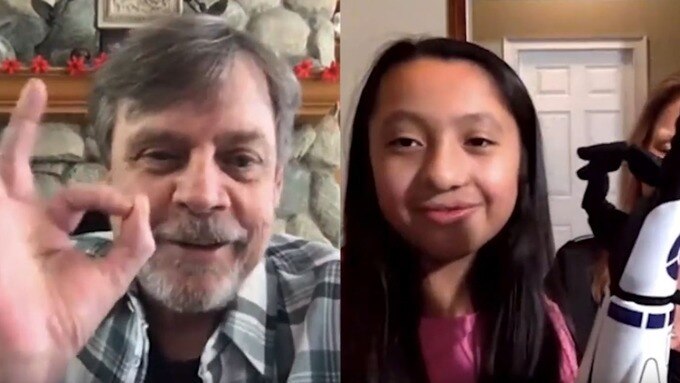 Mark Hamill speaking to Bella, who is the first one to wear the R2D2 bionic hand cover in the United States. (Image Credit: OpenBionics/YouTube)