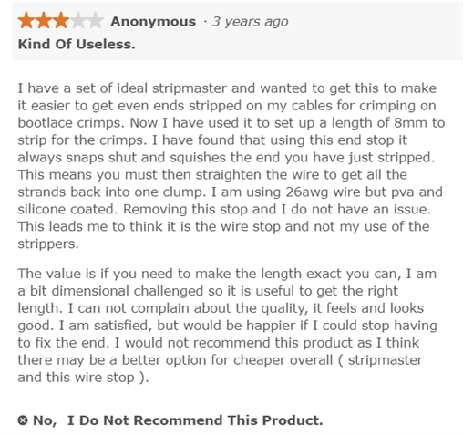 As needs increase, they are no longer adequate. I can’t trust them to ensure zero strand loss when stripping wires. Some are especially useless with high-performance insulation such as PTFE, which is harder than PVC. The repeatability is a major issue with low-cost wire strippers. When I’m having to strip a dozen wires for a connector, it is really tiresome if some wires get accidently cut or nicked, and then all the wires are no longer the same length unless I trim all other wires.