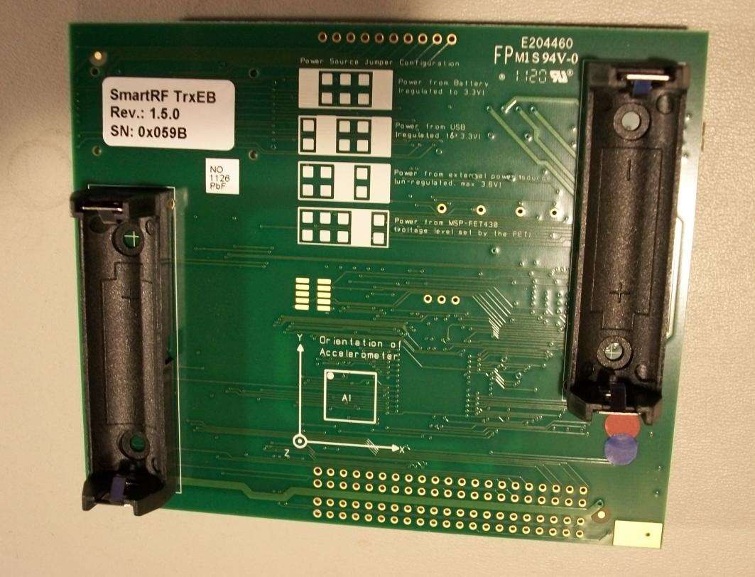 Next step was to examine the boards, so I started with the two SmartRF TRXEB. The top side has a TI MSP430 microcontroller, a debug interface connector for the MSP430, an LCD display, four push buttons to navigate through the control menu displayed on the LCD, a USB connector, four LEDs, and multiple switches for selecting the functionality modes. On the upper right corner there are two connectors for plugging one of the evaluation modules (CC110L, CC113L, CC115L). Here is a picture of the top side:
