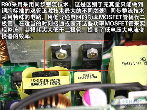 R90配备了一枚T10KB80整流桥,可通电流为10A,耐压值为800V,而新版多核R80采用的是T6KB60,可通电流为6A。在整流器方面,R90要明显好于R80。这样可以保证R90这款300W电源由足够的余量。