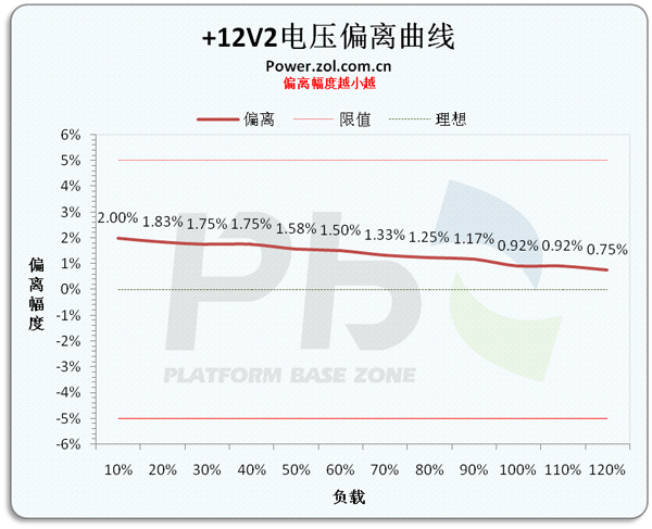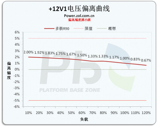 一般来讲,12V负载越重时,电源的转换效率就越高,但是与此同时将会导致电压稳定性严重偏离,从而可能导致硬件受损。所以说,一款优秀的电源,不仅要保证12V输出可以加重载并获得较高的转换效率,而且还要保证在重载的情况下电压的偏离能够得到有效的控制。