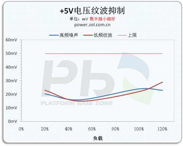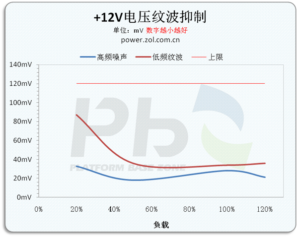 纹波抑制同样是判断一款电源品质优劣的重要衡量标准。纹波测试检测电源在满载状态下各路输出的直流波形,分为低频10毫秒与高频10微妙两个频段测试,Intel规定电源+12V满载时高低频纹波上下振幅之和不能超过120mV,+5V/+3.3V满载时高低频纹波上下振幅之和不能超过50mV。