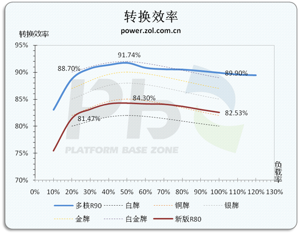 通过测试可以看出,R90的最大输出功率达到了365W(120%负载下),而测试的效率非常接近90%,也就是说,当我们拿R90当350W电源用时,它依然可以达到银牌的水准。另外,和之前的新版R80相比,R90在效率上的提升非常大,这当然都要得益于后者先进的设计方案和高规格的内部用料了。