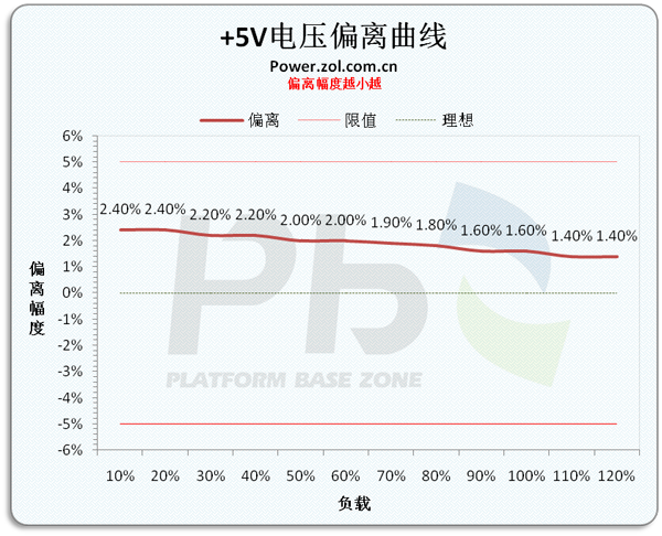 目前市面上销售的电源设计都遵循Intel的ATX12V规范来设计,在这个规范中Intel规定除-12V之外的各路输出电压的偏离幅度不得超过5%,这个测试中第一要看电压偏离是否超过5%,以此为及格线,再者要看电压偏离幅度与高低负载的波动幅度,以此判断电源是否能够称之为优秀。