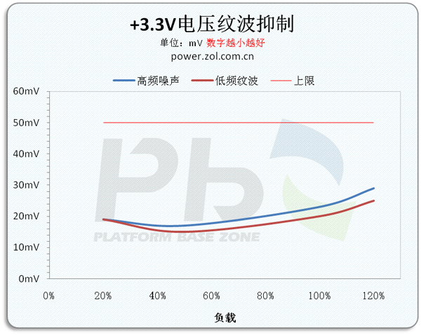 通过测试可以看出,12V在20%负载下的低频纹波表现有些诡异,居然要比高负载下的纹波还要高。此外,5V和3.3V的表现非常出色,均为超过30mV。