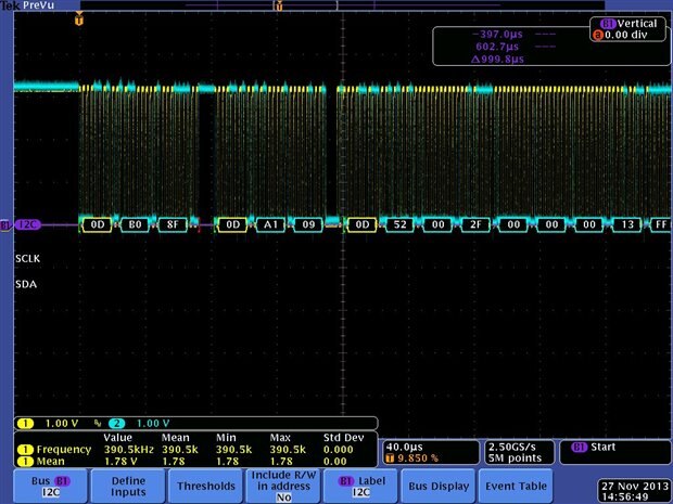 I played with the Signal Analysis Module, DPO4EMBD, for the Tektronix MDO4000 mixed-mode scope today. It's nice that it translates the bits and parses I2C fields. I really liked that it still worked even when I set a sweep rate so low that the bits ran together on the screen.