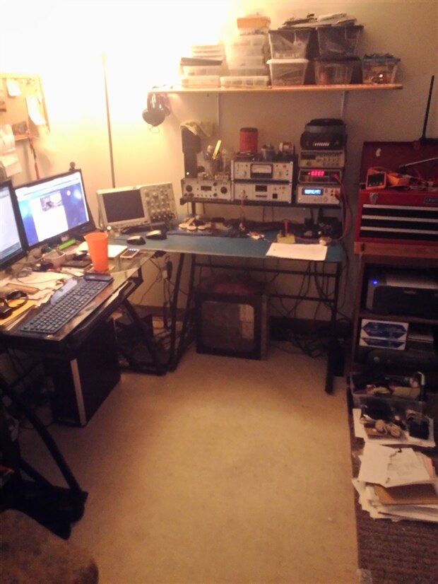 here my "lab" in its current state it is actually clean as i had to find some important documents recently. normally the only area somewhat clean is around the mouse. I use tackle boxes and the shoe box type of containers for most of the bits floating around. the hard part of having a tiny space if finding places for the finished projects or less frequently used equipment. most of it is stored in a closet in a different are of the house. It has put the space for a lab on the top of the house buying list.