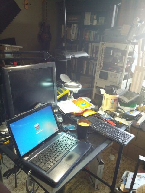 For many years (24 to be exact) my home electronics test bench has been set up in our study, sharing space with our home office computer desk and my son's computer desk. As the photo below illustrates, I have plum run out of space. There is not enough open space on my desk to set up anything bigger than a small dev kit. Components and test equipment and projects underway, but not finished, are accumulating under, beside and behind the desk. The space is so cluttered that I have to carefully untangle test leads and scope probes every time I go to make a measurement. The clutter is also dangerous. My hot air soldering station is covered with parts and sits very close to my computer speakers and a stack of test equipment. Test leads have been singed accidentally as they get draped over idling soldering irons or hot air tools. It is time for a fresh start in a new space.