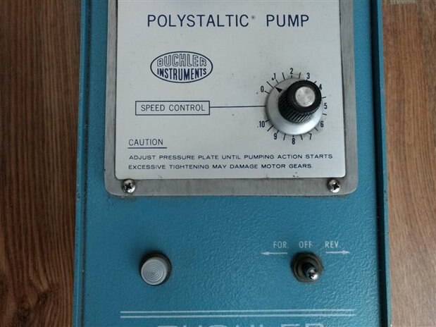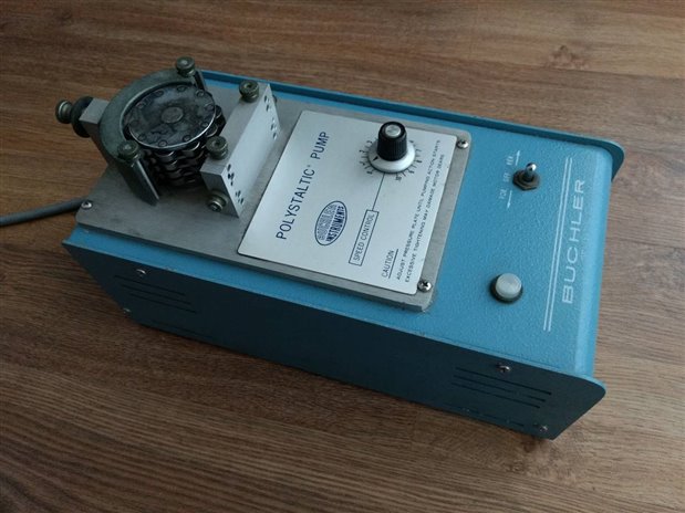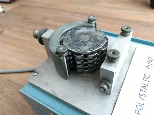 This is a peristaltic pump, it pumps liquid through a wave-like pressing of a tube action. The tube is plastic, flexible, and in this cased coiled in the round thingy. These pumps are used in science and medicine, when you need to keep the liquid away from mixing up with previous liquids (that could have been left in the internals of a traditional pump). This model supports different speeds and forward and backward direction.