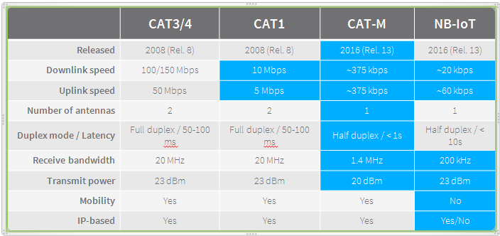 - CAT-M/LTE-M: fits traditional 2G-type applications, devices that require mobility, such as asset trackers, as well as battery-powered IoT sensors. Defined in 2016, it is not yet fully globally available, but is predominant in North and Latin American and Asian markets with early LTE adoption.
